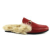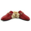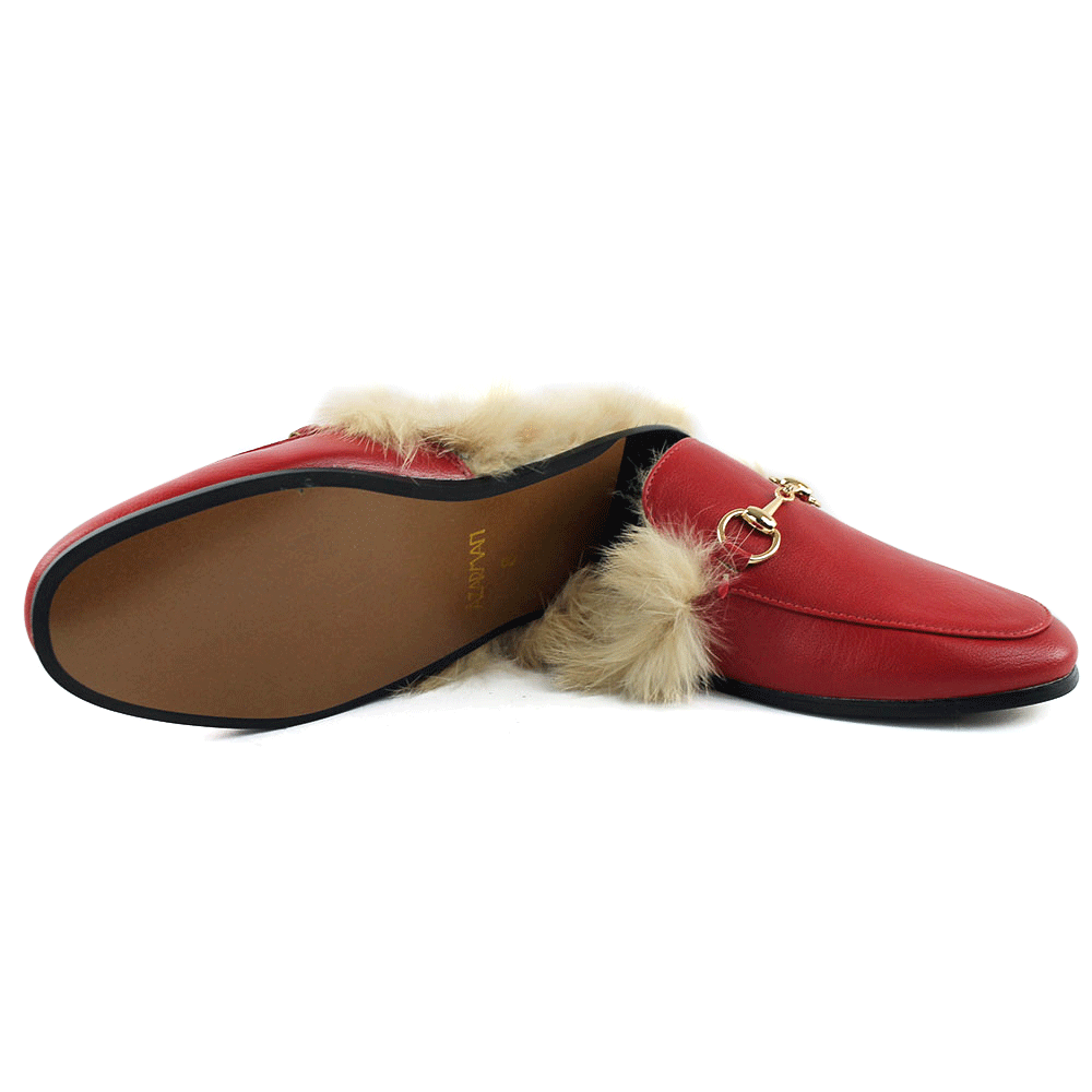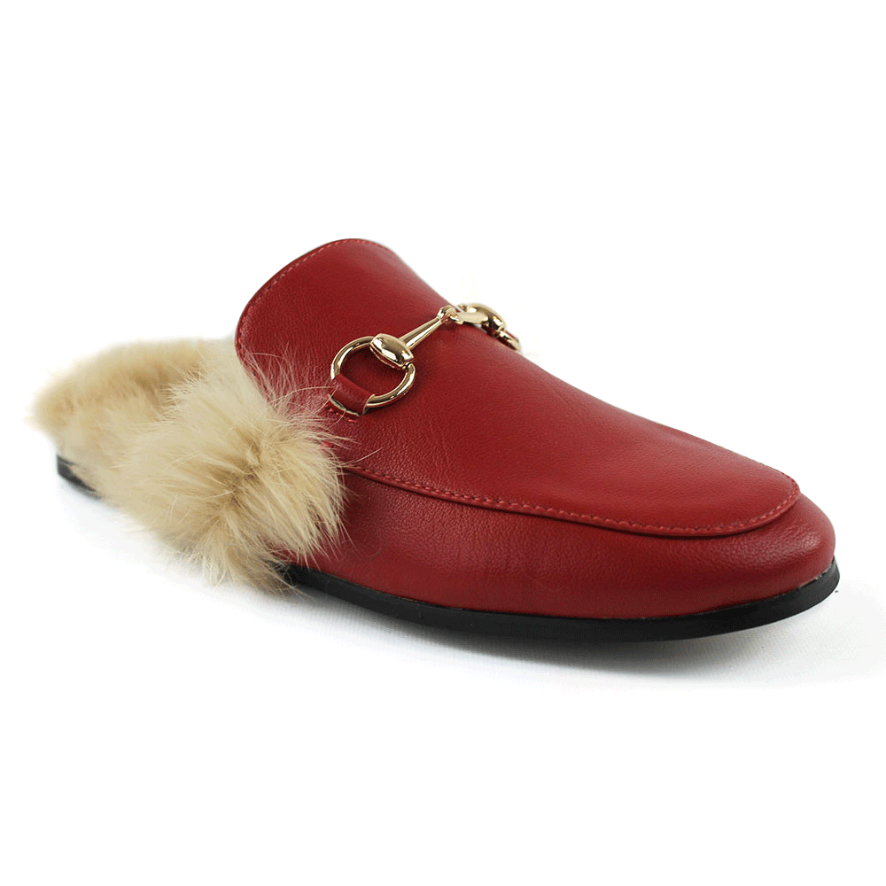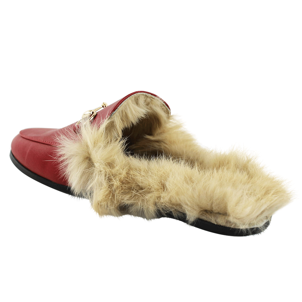 Red Leather Backless Slip On Fur Gold Buckle Loafer