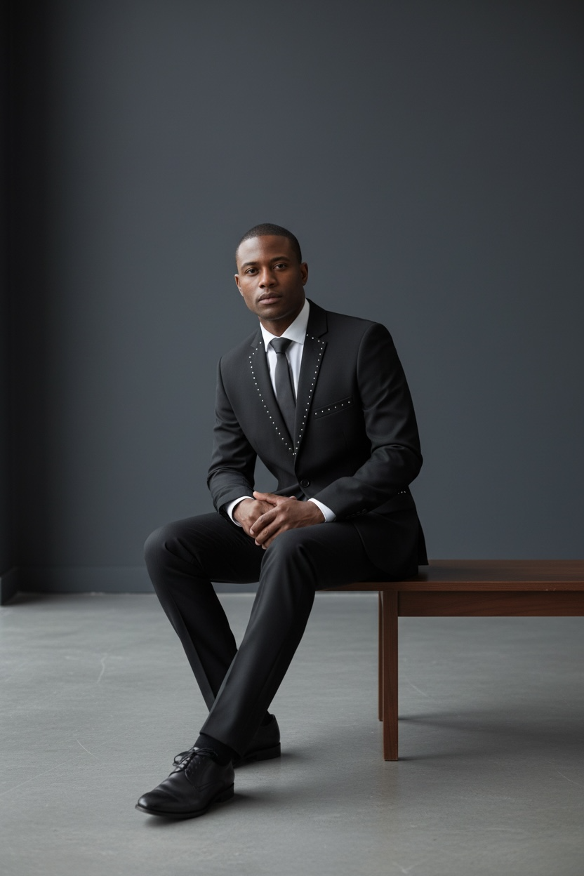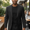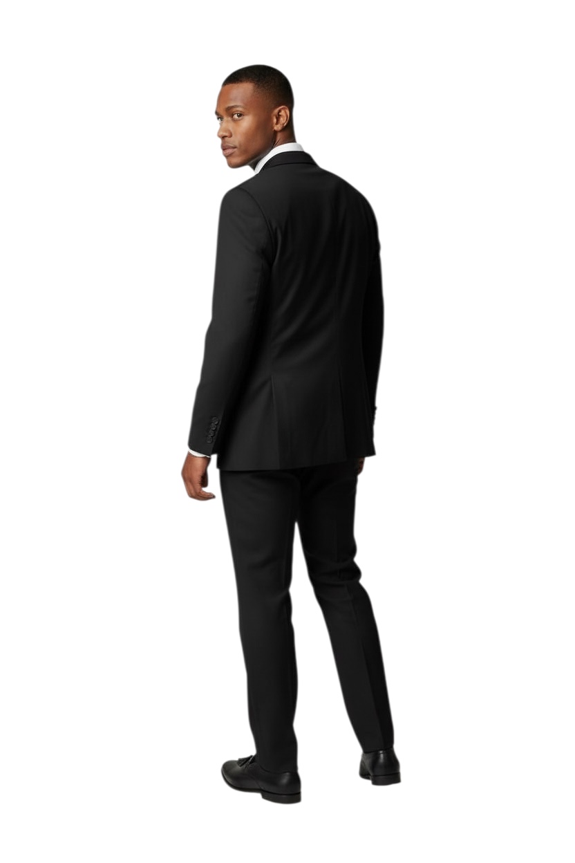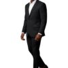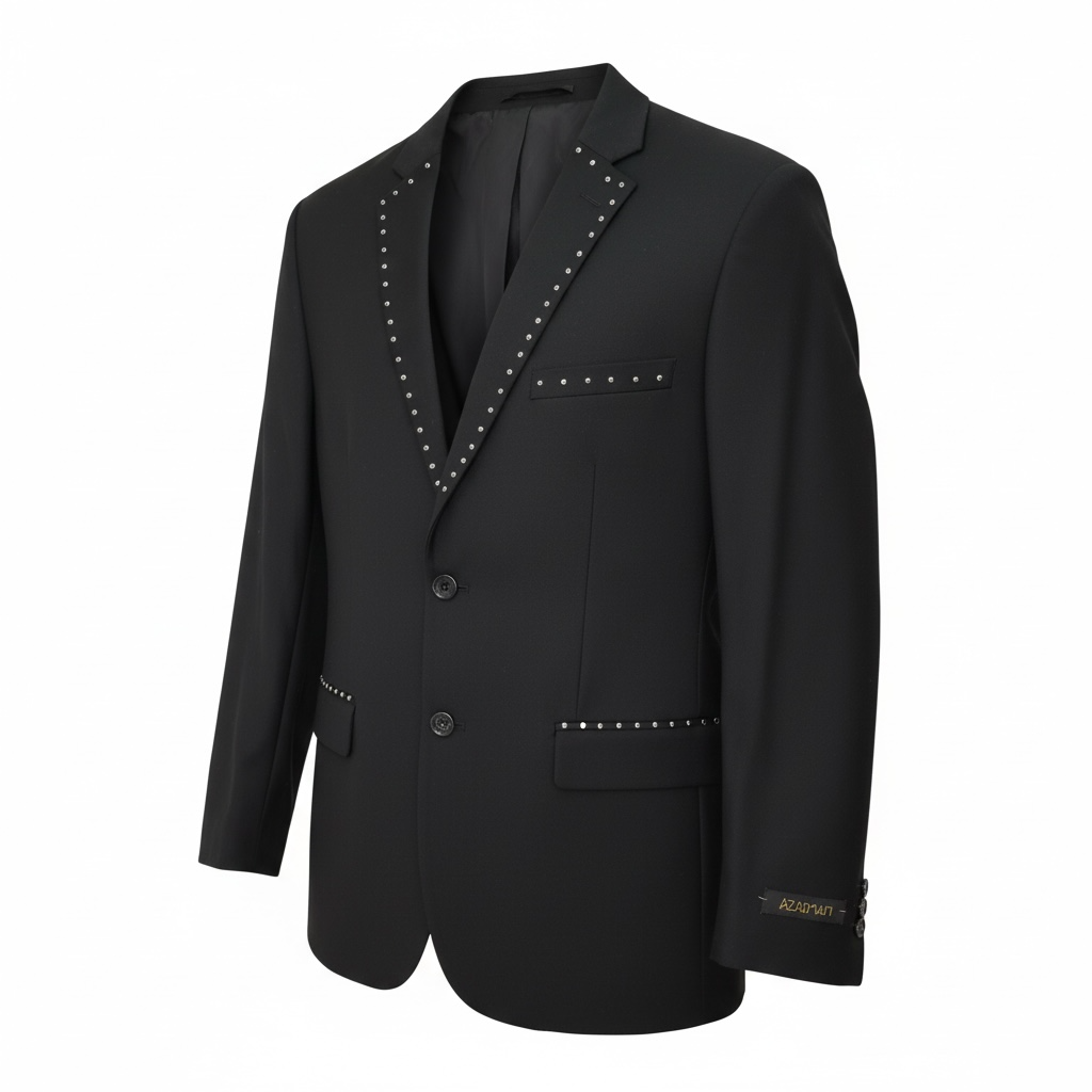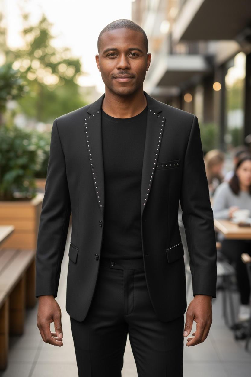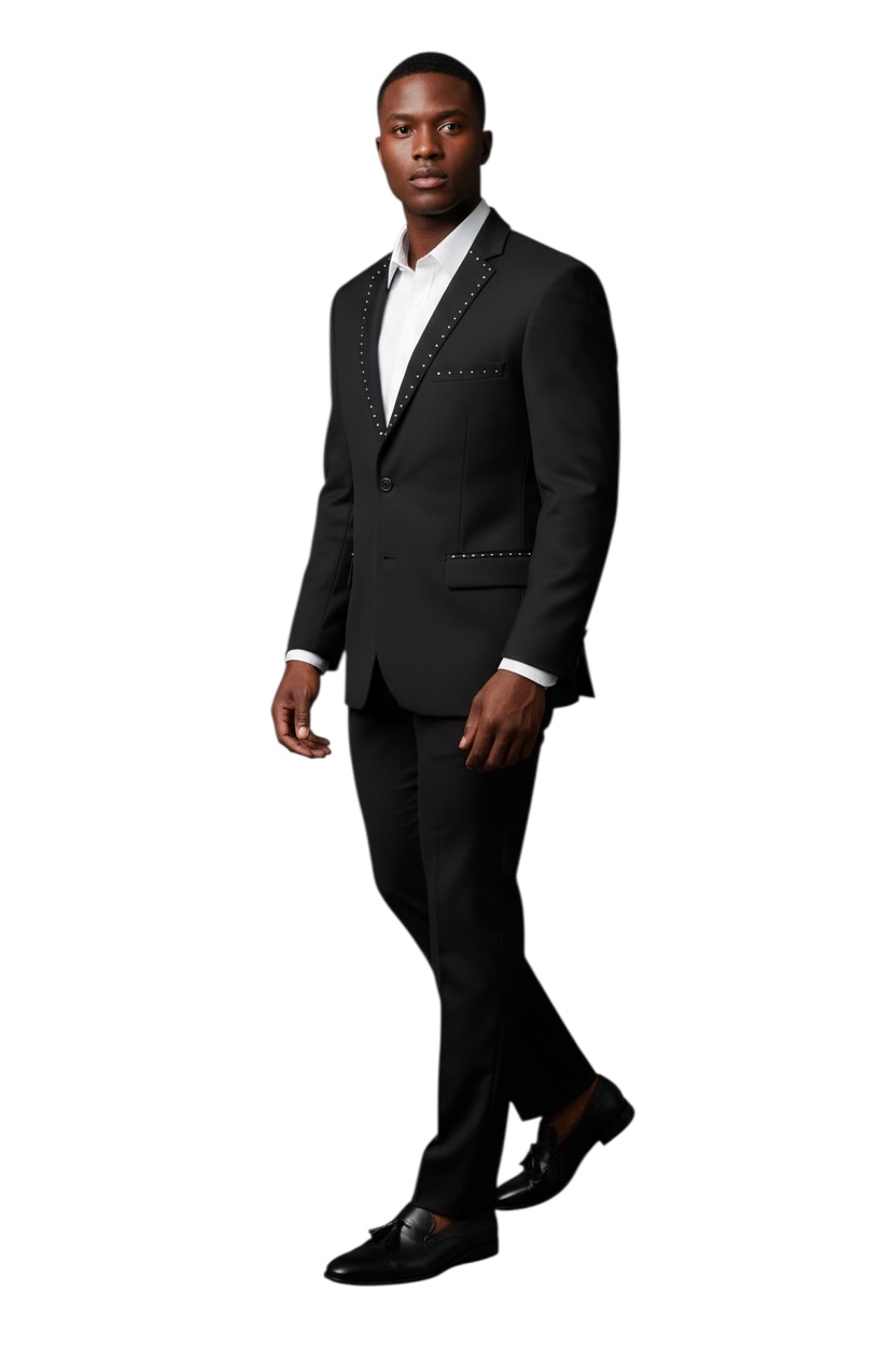 Slim Fit 2 Button Me’s Solid Black Suit With Silver Studs Rhinestone Details