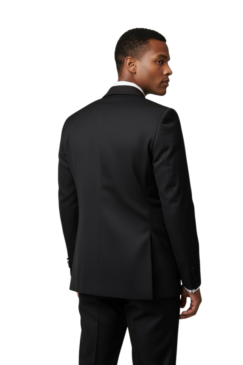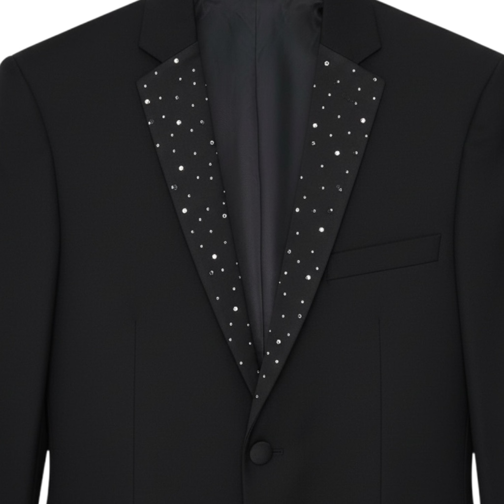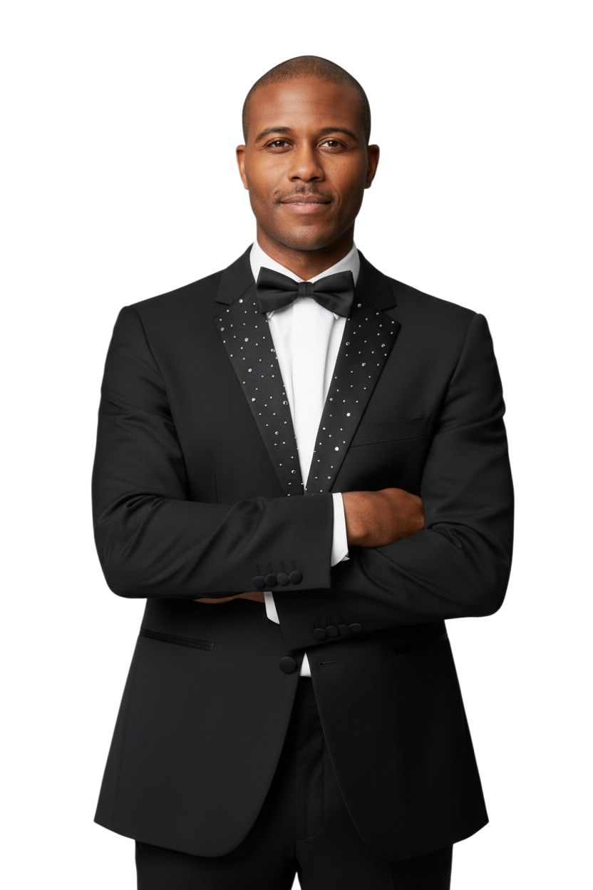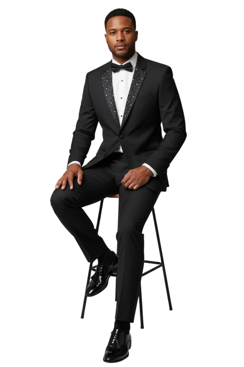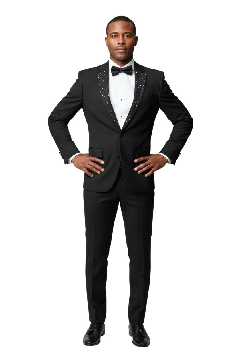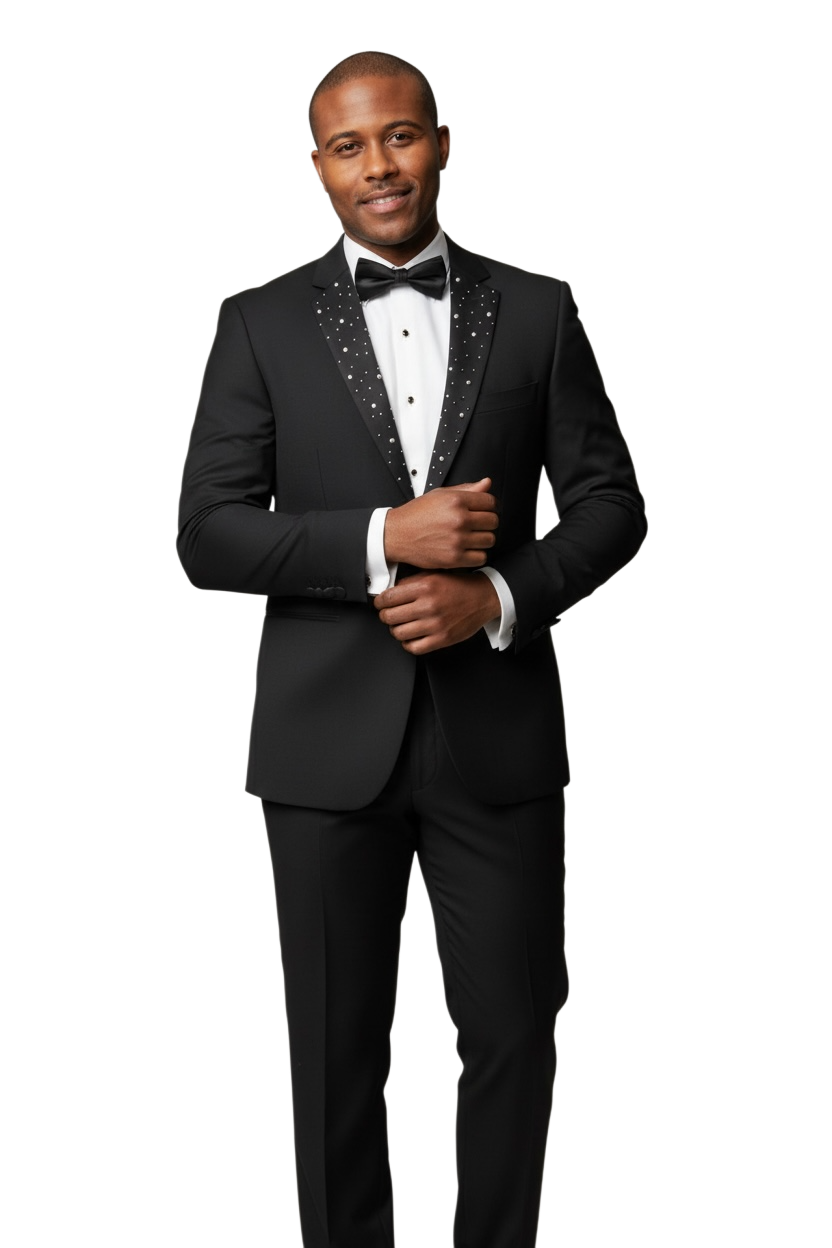 Slim Fit 2 Button Notch Diamond Lapel Rhinestone Black Mens Tuxedo