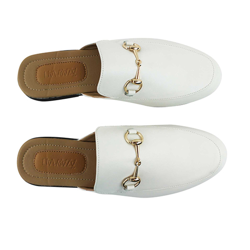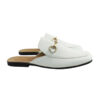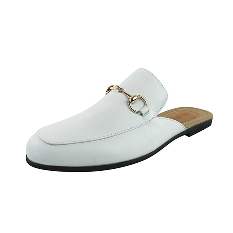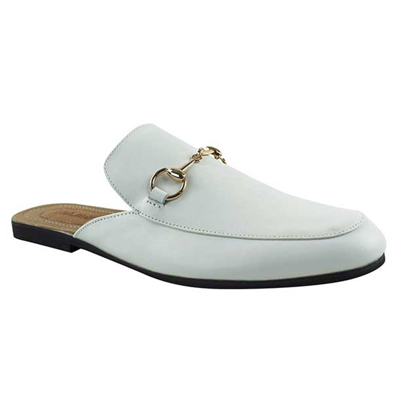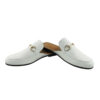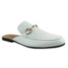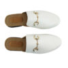 White Leather Backless Slip On Gold Buckle Loafer Mule